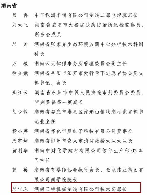 • 為表彰先進(jìn)、樹立榜樣,進(jìn)一步引領(lǐng)和激勵廣大婦女堅定不移聽黨話、跟黨奮進(jìn)新征程,豪情滿懷、意氣風(fēng)發(fā)投入推進(jìn)中國式現(xiàn)代化的偉大實(shí)踐,日前,全國婦聯(lián)決定授予10人全國三八紅旗手標(biāo)兵稱號,298人全國三八紅旗手稱號,授予199個單位全國三八紅旗集體稱號,其中,來自桃源的湖南三特機(jī)械制造有限公司技術(shù)部部長 邱寶珠 獲得全國三八紅旗手榮譽(yù)。